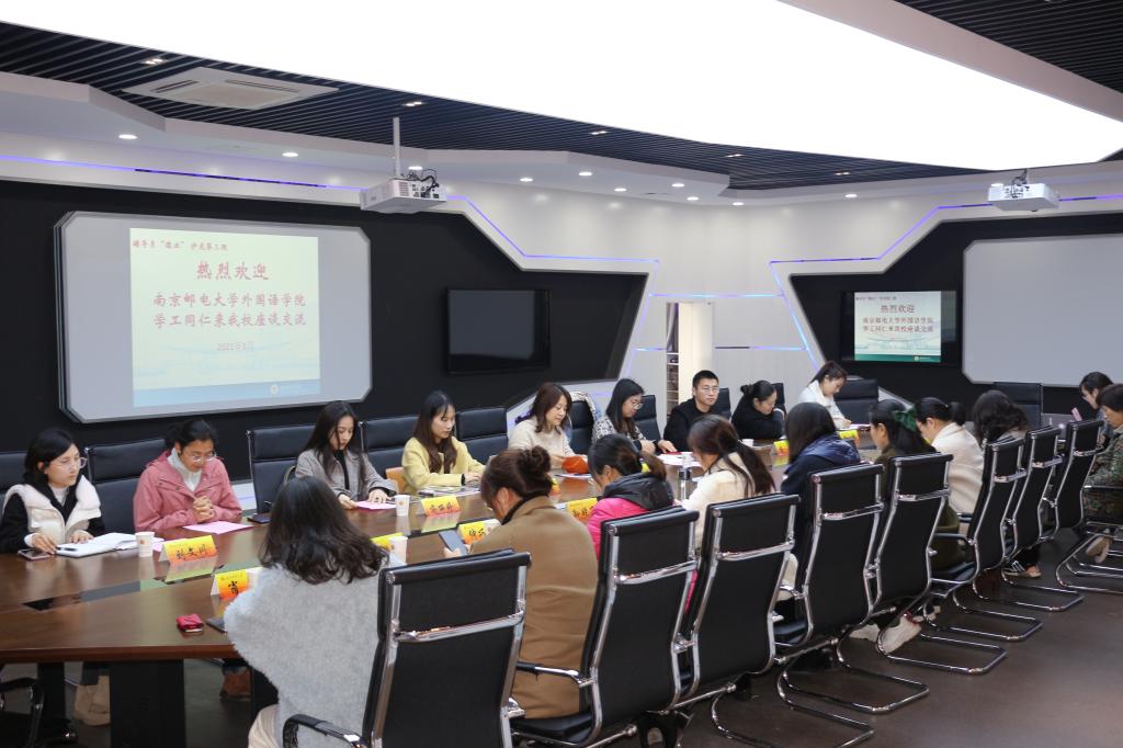 3月18日下午,学工系统老师专题座谈会暨“交流催新砥砺前行,携手并进共赢未来”辅导员“德业”沙龙第三期在仙林校区德业楼211会议室举行。南京邮电大学外国语学院党委副书记徐欣娅一行应邀来bat365参加此次活动。营销与物流管理学院、信息工程学院、应用数学学院学工系统老师,分团委副书记及学生会主席团成员参加座谈交流。会议由应用数学学院党总支副书记布丹丹主持。