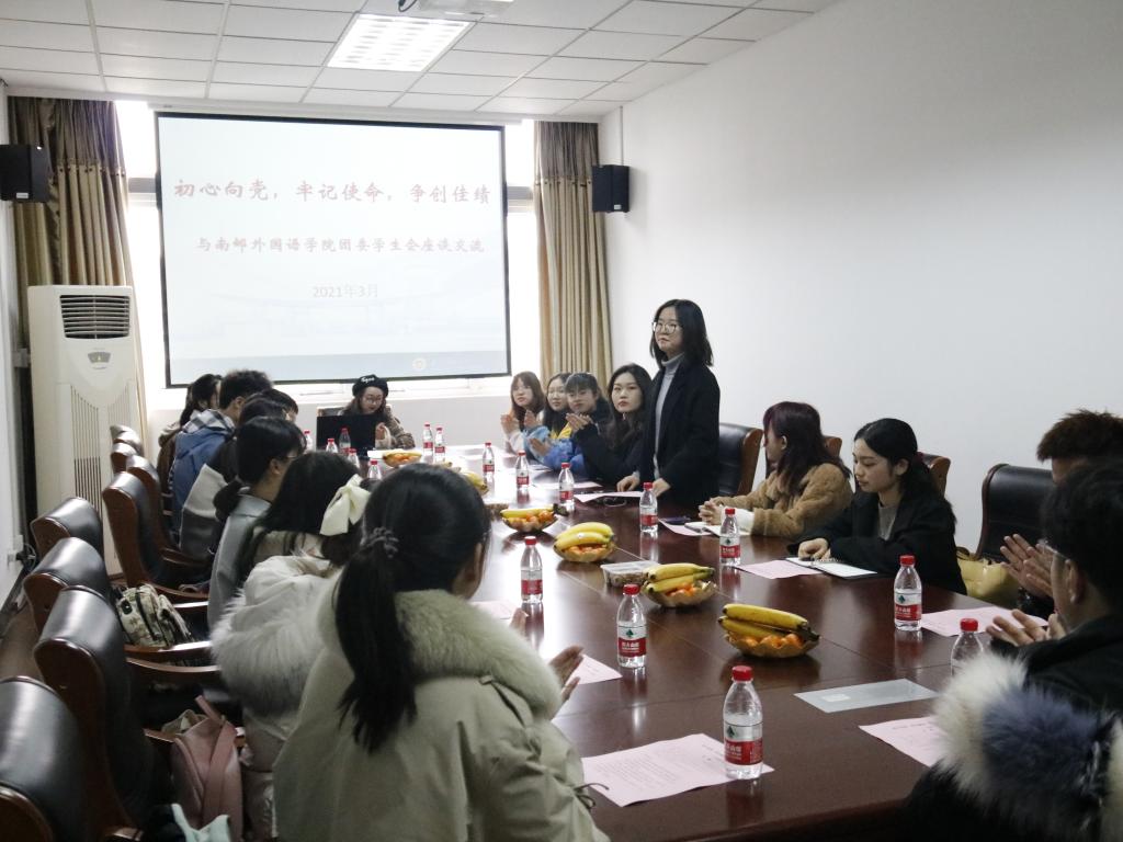 随后,三个学院的分团委、学生会主要学生干部在仙林校区德业楼301会议室进行了专题座谈交流。南京邮电大学外国语学院学生会主席赵冰、副主席贺丽璇分别介绍了院学生会的工作特色、团队建设、品牌活动等方面的经验。同学们就当前分团委和学生会工作的重点和难点、开拓创新工作思路、跨校联合活动等方面进行了深入交流。