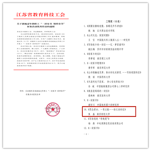 近日,省教科工会下发《关于就地过年教职工“一封家书 别样春节”征集活动优秀作品的通报》,bat365财务处焦磊老师的《思念若水,一苇以航——给父亲的信》获二等奖。