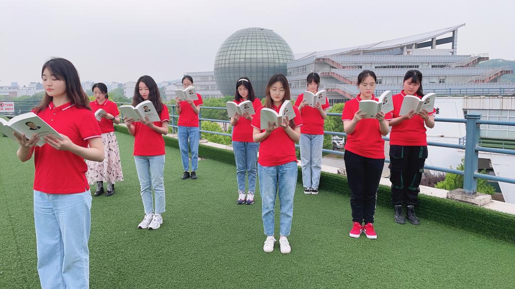 “Bonjour,je suis Li Xuanyi de la class de français 1901. Aujourd'hui, je voudrais apprendre avec vous l'histoire de la première coopération entre le Parti Nationaliste et le PCC.”“大家好,我是法语1901班的李烜仪,今天,我将和大家一起学习有关于国共第一次合作的这一段历史。”这是外国语学院“多语种讲党史”的一幕。午间,师生党员们组织在一起,穿上红色院服翻开《中国共产党宣言》《习近平谈治国理政》第三卷英文版,齐声诵读,在课余汲取精神力量、汇聚信仰之光。负责发起这场“红色经典诵读”的两位教工党支部书记陈芙蓉、蒲婧新老师说:“两本经典不仅思想经典,译法也非常经典,反复诵读,不仅可以掌握精当的翻译技术,而且能够使人振奋。诵读经典应当成为高校师生的常态。”