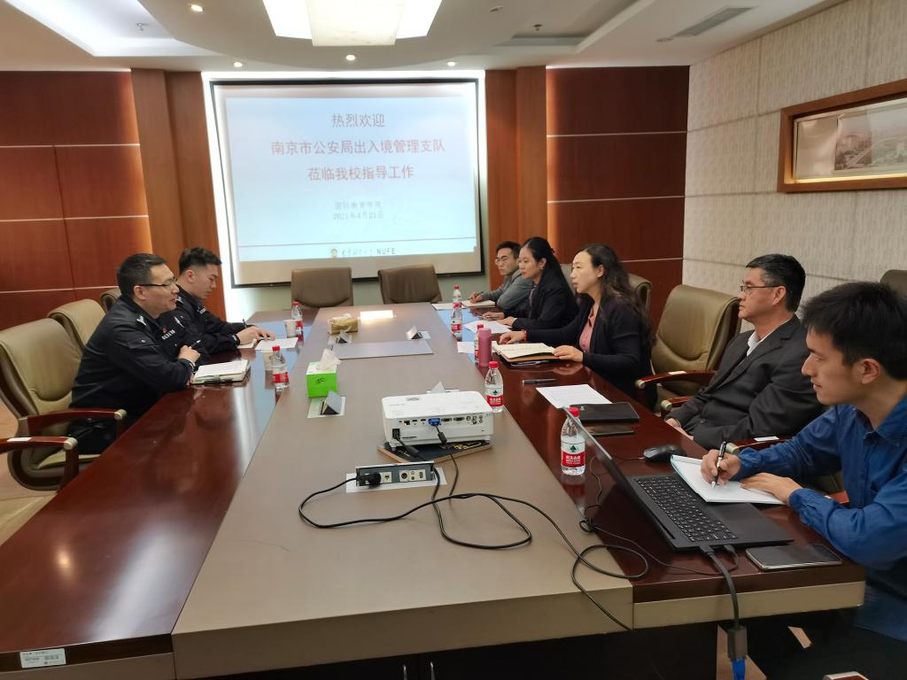 4月21日上午,南京市公安局出入境管理支队警官祝军、陈云鹤来bat365调研指导国际教育学院留学生工作。国际教育学院党工委书记王娟、院长黄能、副院长吴艾莉参加调研座谈会。
