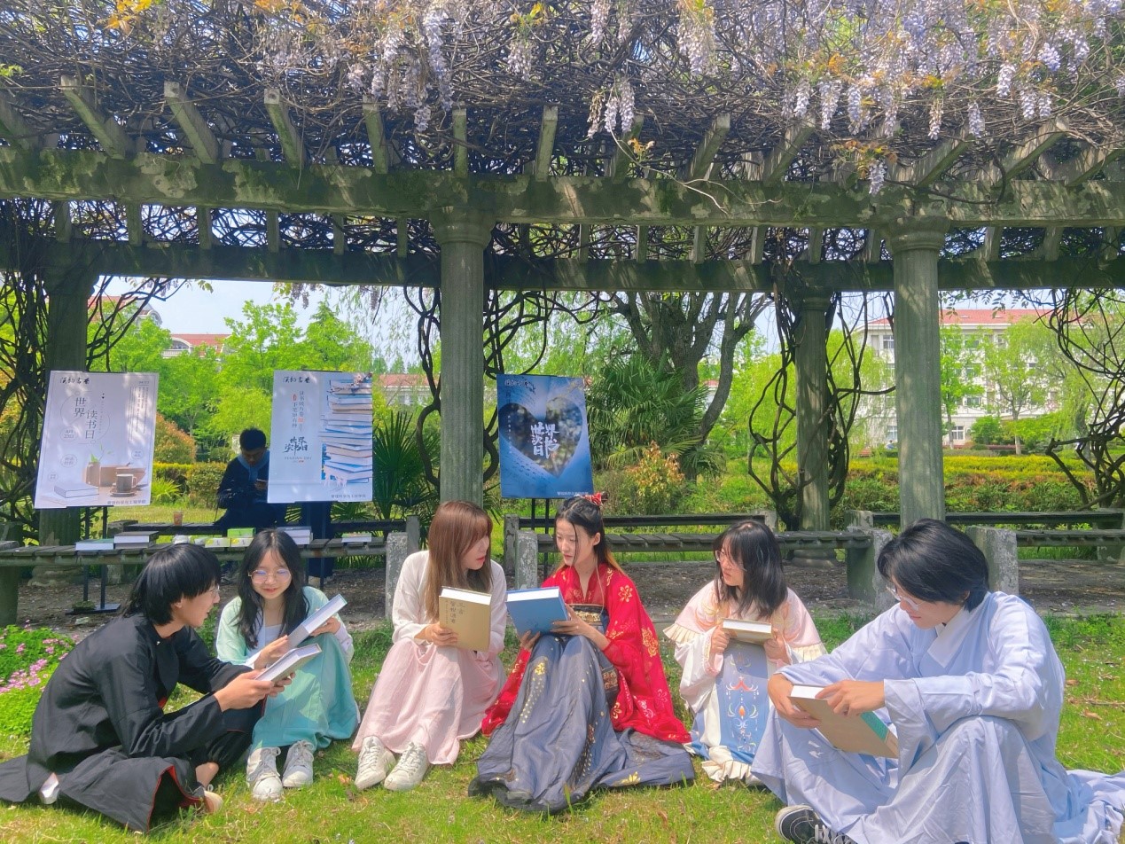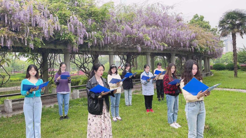 阅读经典书籍。财政与税务学院开展了红色经典朗诵会暨“与春书”自由阅读成果展。诗朗诵《基层献青春》以饱满的热情、高昂的斗志讲述了“全国脱贫攻坚楷模”黄文秀书记的故事。同期开启了“与春书”自由阅读展打卡通道,鼓励同学们通过手抄书、音频等多种形式,将自己的小感触、小奇思随时随地记录下来,每日通过微信小程序打卡,养成阅读和记录的好习惯。管理科学与工程学院组织中外学生一起身着汉服,阅读红色经典著作,分享党史书籍阅读体会。外国语学院英语、法语专业学子利用自身语言优势,自发组织在紫藤树下畅读莎翁经典。学院各班班主任给每位学生推荐一本书籍,倡导读书之风,启迪读书之行,班主任胡阳、段慧老师每周三清晨与学生共读书、畅聊书,一起感受阅读之美。