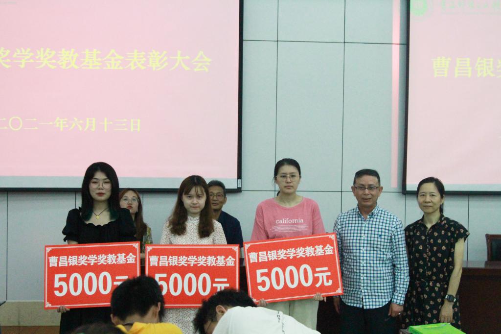 之后,在工科楼阶梯教室举办了曹昌银奖学奖教基金表彰大会,表彰一志愿填报并录取为学院研究生的学院应届毕业生。许文彪书记宣读了曹昌银奖学奖教基金关于应届毕业生考取本院硕士研究生奖励办法,每人奖励5000元。曹昌银董事长和冯建红女士为获奖毕业生颁奖。最后,曹昌银董事长表达了对母校的感激和身为南财人的自豪之情,讲述了创业过程的艰辛与努力,希望学弟学妹不仅要勤奋、踏实学好专业知识,还要多参加社会实践,提高自身修养,不断完善自己,成为国家和社会的栋梁之才。