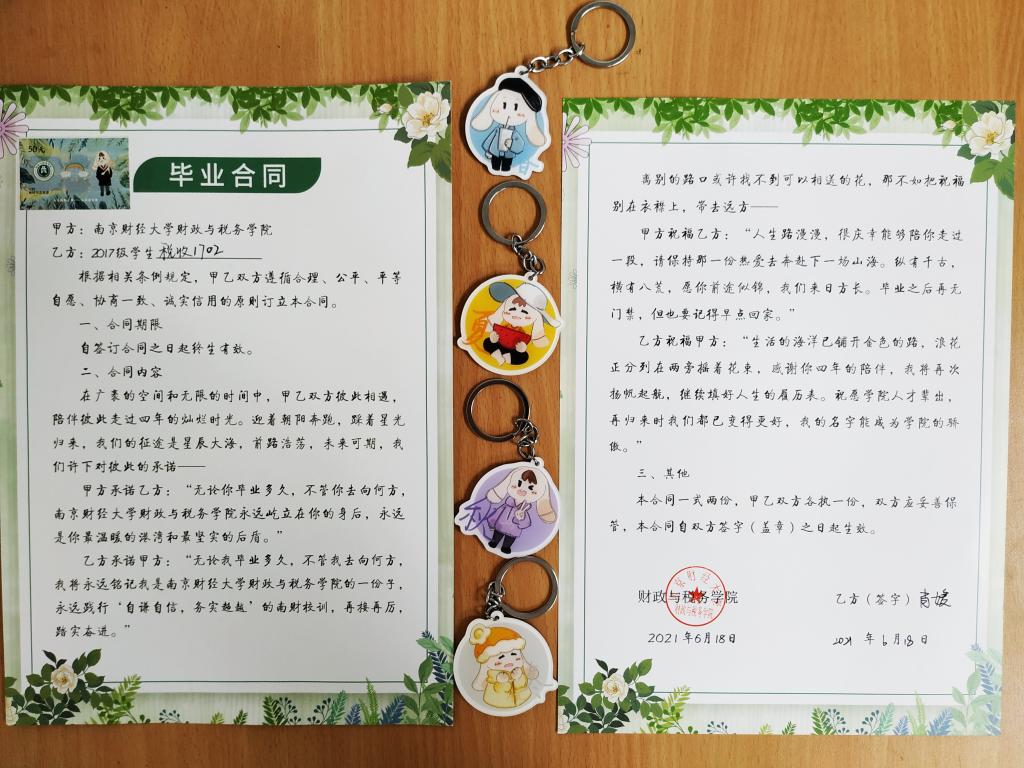 “在即将离开母校和学院的时候收到这样的礼物,感觉很温馨。这份毕业合同承载着我这四年的无限回忆,给我的大学生活画上了一个完美的句号。分别之际,最难舍的还有我的三个可爱的室友,带上这个钥匙扣,就感觉她们一直陪伴着我,互相鼓励、互相帮助,就如我们在学校时一样。”毕业生朱慧这样说道。
