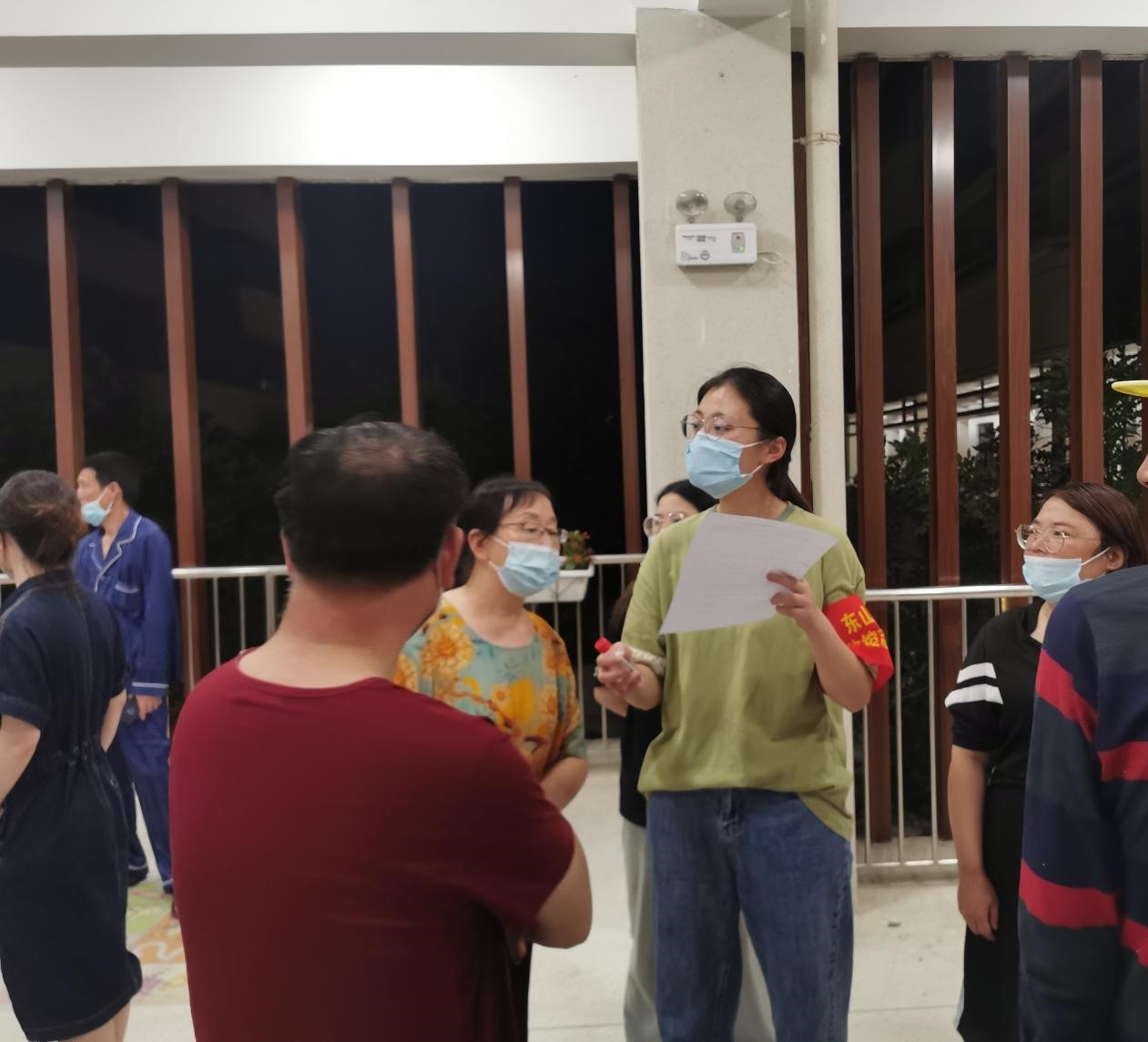 王蕊同学是法学院在读研究生,同时也是一名中共党员。她主动申请加入了江宁区东山街道防控志愿者行列,同医护人员一起奋战在抗疫最前线。王蕊主要负责登记前来检测人员的姓名、性别、年龄、身份证号(或护照号)、手机号、住址等个人信息,同时引导居民有序接受核酸检测,对于登记有困难的群体给予耐心帮助。由于疫情突发,志愿者们只能通过前一天晚上打印好的表格进行手写登记。“登记的时候不敢懈怠,手不停地写着,尽管酸疼,但也要忍着。因为怕前来检测的市民等太久,天气比较热,希望能快点让大家都检测完。不仅要快,还要准确,否则查验不到信息,就是白费功夫。”一天下来,王蕊用光了几支笔的墨水。