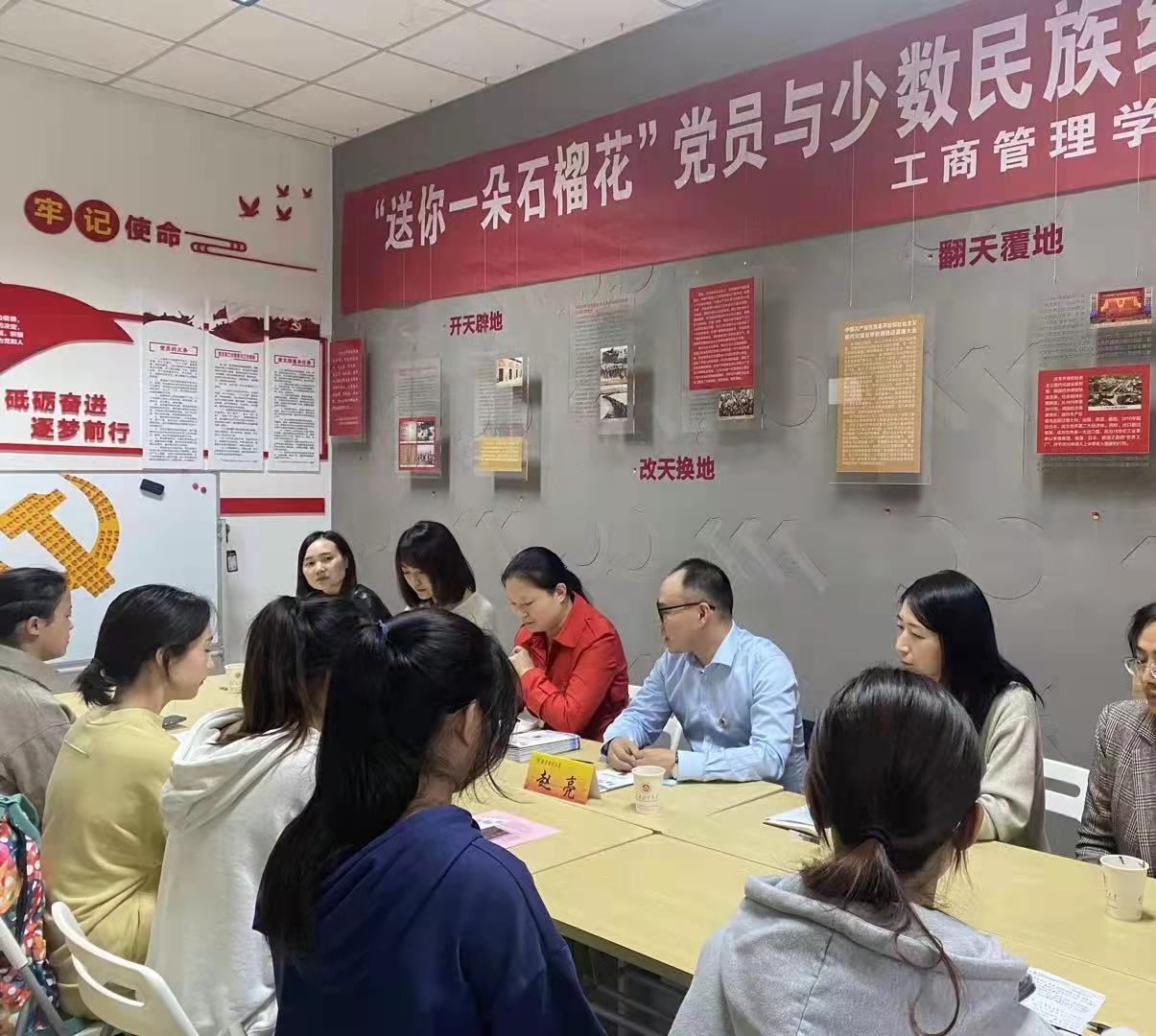 为贯彻落实bat365深化新时代民族团结进步教育工作的要求,充分发挥党员先锋模范作用,营造民族团结进步的良好氛围,10月29日中午,工商管理学院、应用数学学院在仙林校区中苑七号站“纽扣空间”学生党建联盟工作站联合开展“送你一朵石榴花”党员与少数民族学生结对活动。统战部副部长陈洁、学生处副处长赵亮、工商管理学院党委副书记全真真、应用数学学院党总支副书记布丹丹,两个学院的学生党支部书记、党员和少数民族学生代表参加活动。活动由全真真副书记主持。