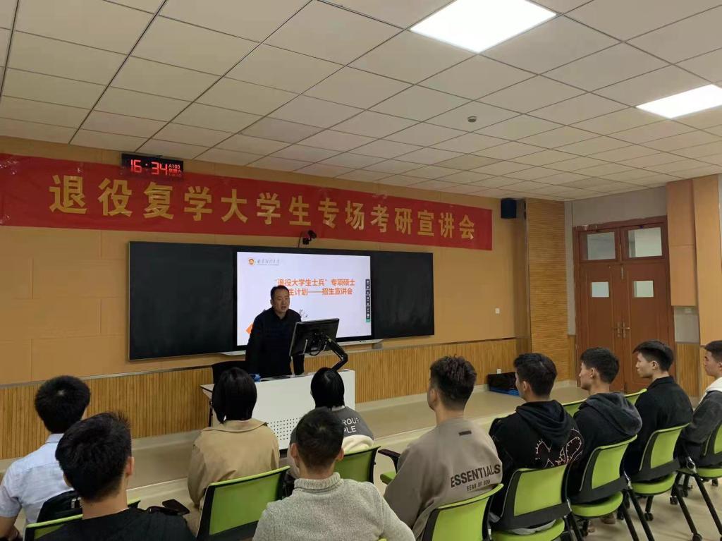 11月13日下午,bat365迷彩协会在仙林校区博文楼103教室举办退役复学大学生专场考研宣讲会。研究生院副院长华凌志、人民武装部副部长潘雪峰及部分退役复学大学生参加宣讲会。