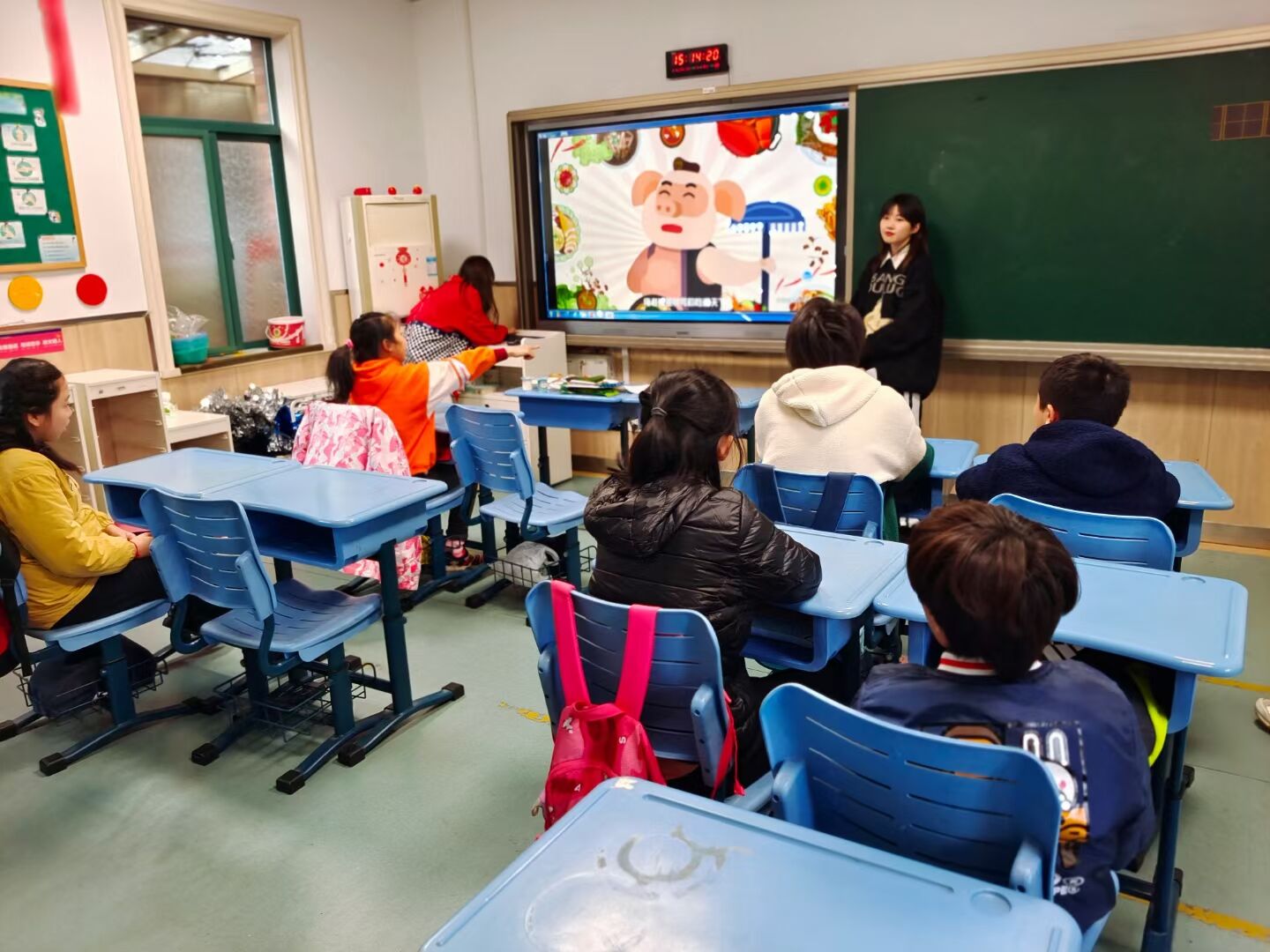 志愿者分六个小组为不同的班级进行授课。活动开始,主持人向小朋友们介绍了世界儿童日的背景,讲述了食品安全的相关知识。在实物和卡片展示环节,通过对比食品腐败前后的变化,志愿者们教小朋友们判断食品是否变质,带领小朋友们寻找食品包装上的保质期和生产日期,通过这样的方式去快速辨别食品是否还能食用。