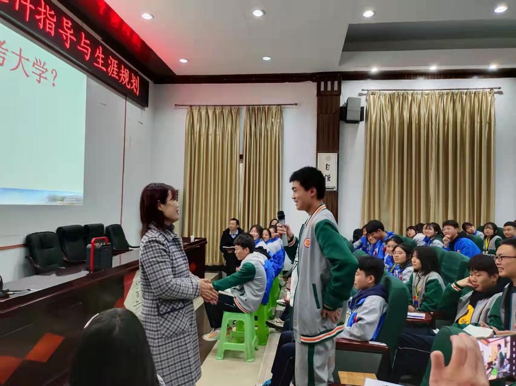 讲座分为生涯唤醒、高考改革与选科、发现自己的兴趣密码、走进象牙塔四个部分。讲座中,甘诺副教授分享了生涯规划的基本环节——“懂自己、明环境、慧选择、重行动、常反思”,引导学生思考并讨论“为什么考大学?”她强调,在选科时将国家需求和个人发展相结合,视野就会更宏阔,志向就会更高远。“没有规划的人生是拼图,有规划的人生是蓝图”,甘诺副教授表示,从拼图到蓝图,是对立统一、协调发展的过程,同时也是多种信息合力实现目标的过程。她鼓励高中学子们要力争做“心中有爱、眼中有光、志比金坚、行而不辍”的时代好少年。