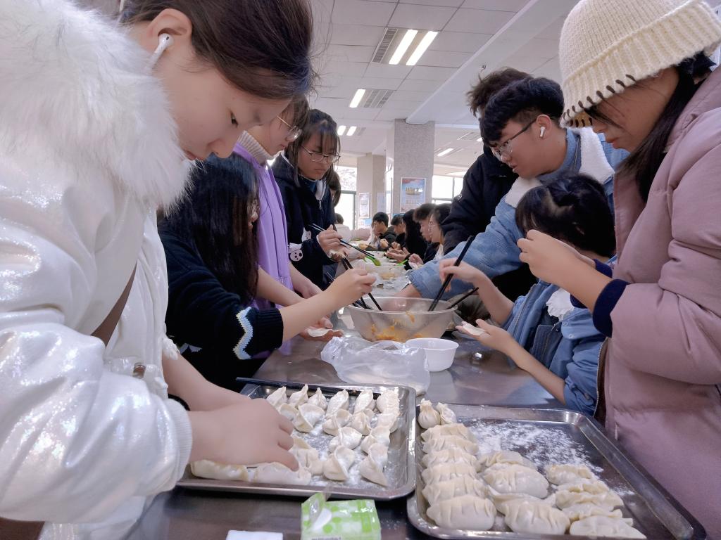 应用数学学院在仙林校区西苑第七餐厅开展“冬至已到秋已远,‘饺饺’相聚共团圆”冬至日包饺子活动。每位同学认真包着各种形状的饺子,有精致小巧的柳叶饺,有大个饱满的东北饺,有象征吉祥的元宝饺,甚至还有含苞欲放的玫瑰状饺子。“小饺暖尽心头寒,更胜金银百十千”,滚烫的饺子温暖的不仅是胃,还有同学们的心。