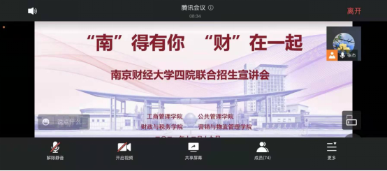 为帮助考生把握高考新政策、谋划成长新视界,搭建“权威、专业、及时”的交流平台,实现高校与高中的信息零距离沟通,帮助考生全面及时地了解招生政策和相关招生信息,尽早科学规划,拓展升学途径,12月19日,由财政与税务学院、工商管理学院、营销与物流管理学院、公共管理学院联合举办的“‘南’得有你,‘财’在一起”线上招生宣讲会通过腾讯会议平台向公众开放直播。相关生源地高中学生及家长,部分报名参加寒假招生宣传母校行的志愿者参加了宣讲会。宣讲会由营销与物流管理学院党委副书记张杰主持。