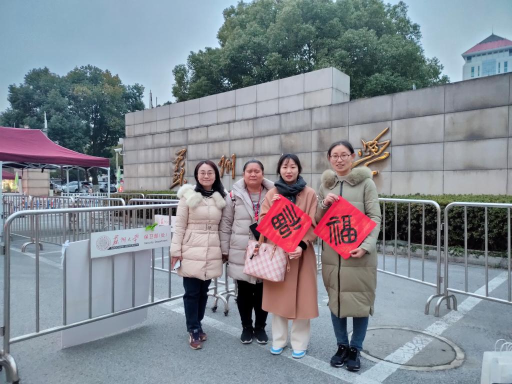 法学院辅导员看望了目前在昆山的新疆籍困难学生,详细询问了学习生活情况,并送去了慰问品,鼓励他克服暂时的困难。此外,老师们走访了就职于苏州市劳动人事仲裁院的杨晔校友、就职于苏州市虎丘区法院的朱凤校友、就职于苏州市吴中区市场监督管理局的骆文珺校友以及在苏州大学读研的谢媛媛同学。在与校友的交流中,师生共叙在校时的美好时光,感怀故情。老师们给校友们送上了法学院龚月红老师亲笔书写的祝福对联和“福”字,校友们则表达了对母校以及师长的感恩之情。