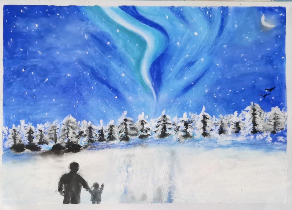 财政2001班管迎杰同学为迎接冬奥作油棒画《极光·未来》。他表示,“极光”意味着新生、希望和未来。我们“00后”大学生和冬奥选手们一样,哪怕前方路途遥远,哪怕冰天雪地,前人和后生,携手并进,看向光,走向光,最后一定能成为光!未来,极光依在,希望依在。