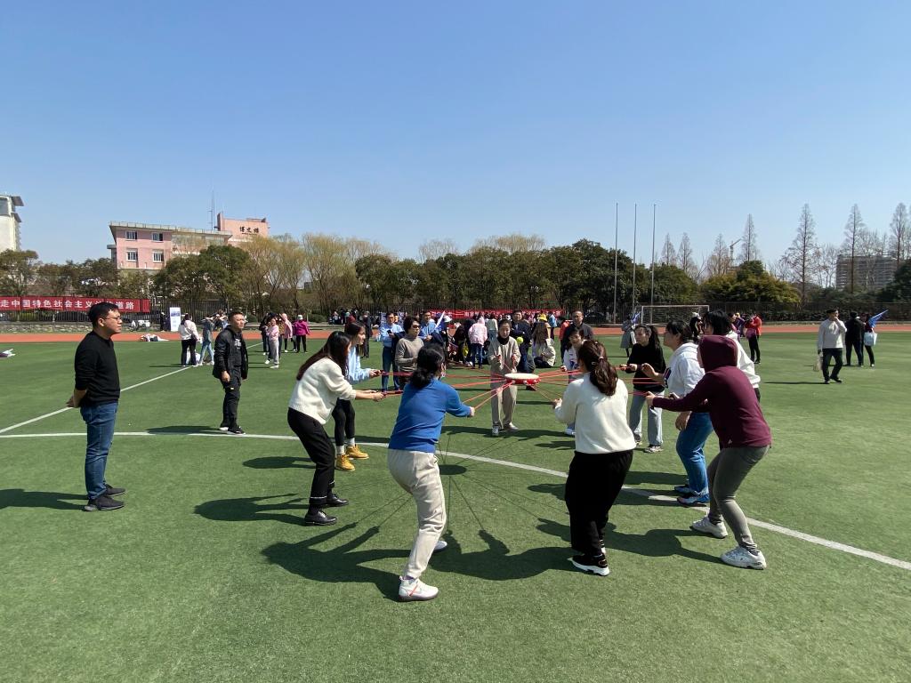 趣味活动秀风采。校工会在西苑操场举办了女教职工同心鼓比赛,来自三十个分工会的260多名女教职工参加比赛。本次活动以分工会为单位组队参赛,每组参赛队员11人,其中10人负责拉住道具(10寸同心鼓)上的弹力绳,一起用力把鼓面拉起,1人控制球放在鼓面上方。比赛开始后,参赛选手通过控制绳子来使鼓面颠球,颠球的高度至少在20公分以上,在规定的3分钟时间内,按完成颠球次数的多少判定名次。最终,图书馆分工会以3分钟颠球378个的好成绩获得一等奖;营销与物流管理学院分工会、经济学院分工会获得二等奖;艺术设计学院分工会、会计学院分工会、后勤基建处分工会获得三等奖。金融学院开展“面向未来快乐生活”女教职工踢毽子、跳绳比赛。大家其乐融融,既锻炼了身体,又放飞了心情,更加深了友情。,营销与物流管理学院举办了“喜迎二十大,一起向未来”女教工环校健身走活动,让老师们在工作之余放松身心,交流工作、学习和生活。