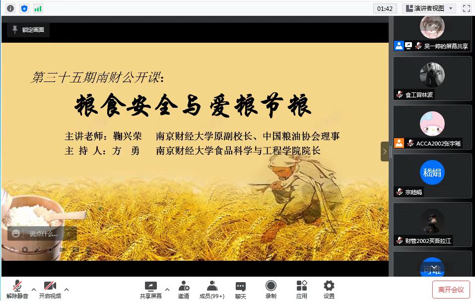 4月14日,由省粮油学会、省科普服务中心指导,党委学生工作部、校团委和校学生会学业发展中心主办,外国语学院与食品科学与工程学院共同承办的第三十五期南财公开课在线上举行。本次公开课主题为“食品安全与爱粮节粮”,省粮油学会首席专家鞠兴荣教授担任主讲人。学生处处长韩力争、外国语学院和食品与工程学院部分教师及本科生400余人参加公开课。本次公开课由食品科学与工程学院院长方勇主持。