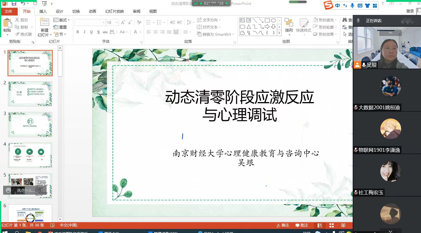 培训以“动态清零疫情防控期的应激反应和心理调适”为主题,围绕“疫情下的心理应激反应”“心理调适与自我照顾”“疫情下的积极心理成长”三个方面展开。吴垠老师表示,持续的疫情容易使大学生遭受慢性心理应激,表现出情绪恐慌、网课不适应、人际隔离、身体亚健康等特点,在情绪、认知、行为、生理上均会出现不同程度负面影响,由此容易诱发“防疫倦怠情绪”,身体不适、成就感降低、替代性创伤等都会导致心理资源的耗竭。吴垠老师建议同学们通过增强确定感、平衡联系与独立、留在此时此地等五方面做好心理调适,并且可以通过“动一动”“写一写”“画一画”和“听一听”四种方式做到自我照顾。最后,吴垠老师表示,希望同学们身处疫情时期也要向阳成长,通过正向思维关注美好、活在当下为所当为、对话陪伴互助赋能、志愿服务升华成长等方式快速调整自我状态,以理性平和心态安于当下,不负韶华。