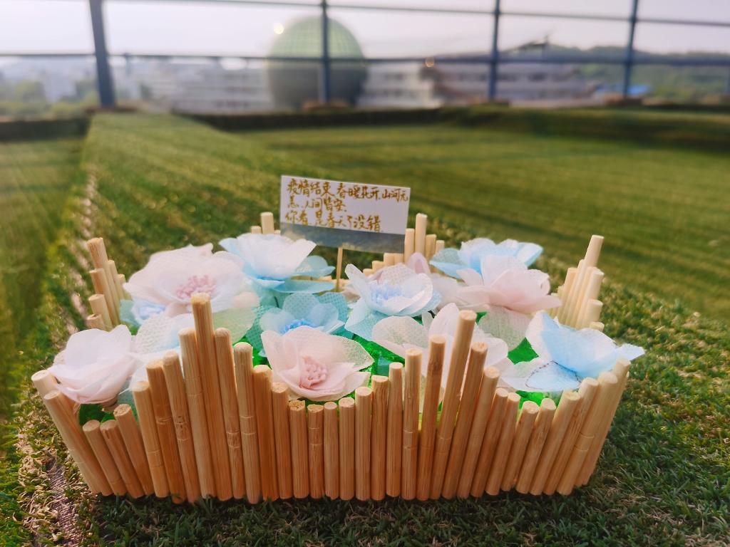 管理科学与工程学院的同学们收集能够二次利用的废弃物加以改造,创造出了剪贴水彩画、宿舍门牌、挂饰等一件件精美生动、创意满满的作品。“我在宿舍里看到闲置的纸袋、鲜花,宿舍空间不是很大,突发奇想将它们拼接在一起,饭后捡了一支树枝,做成装饰品,挂在墙上好看也不占地方。”管理2101班的秋圣洁、杜金苗同学充分发挥想象力,制作了一个简单的挂饰。