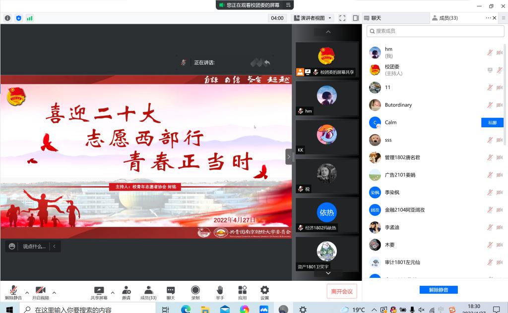 2022年“大学生志愿服务西部计划”招募工作已全面启动,为增进bat365学生对西部计划的了解,鼓励青年学生投身西部、扎根基层、锻炼本领,4月27日,校团委开展了“大学生志愿服务西部计划”线上动员分享会。本次会议的主题为“志愿西部行、青春正当时”。校团委副书记张蔚伟、校团委相关工作人员、校青年志愿者协会负责同学、优秀毕业生代表及部分应届毕业生、在读研究生应邀参会。