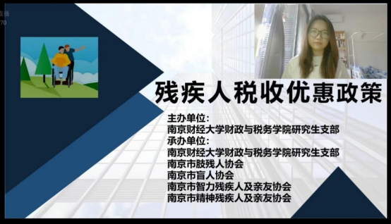 云公益:助力特殊群体,共享税收知识。税收优惠政策惠企利民,关系到社会的每一个人,残疾人也是社会的重要组成部分,因此志愿者们将目光投向残疾人群体,联合南京市残疾人协会特别举办了“助力特殊群体,共享税收知识”公益直播活动。在直播课堂中,税收宣讲团志愿者、21级税务专硕研究生张旻同学讲解了各税种中与残疾人相关的税收优惠政策,补充介绍了南京市残疾人财政补贴优惠政策。对于一些晦涩难懂的税法条规、难以理解的规范表述,张旻结合简短的视频、贴近现实生活的案例进行生动化、形象化的讲解。