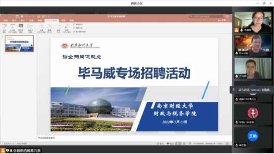 为贯彻落实省政府和bat365关于毕业生就业工作的决策部署,全力促进毕业生更加充分更高质量就业,全面深化校企合作,5月13日晚,财政与税务学院联系毕马威公司线上开展了访企拓岗促就业专项行动。学院副院长方国昌、毕马威全国校园招聘负责人李延均以及学院部分本科生、研究生参加专项活动。活动由学院党委副书记李慕原主持。