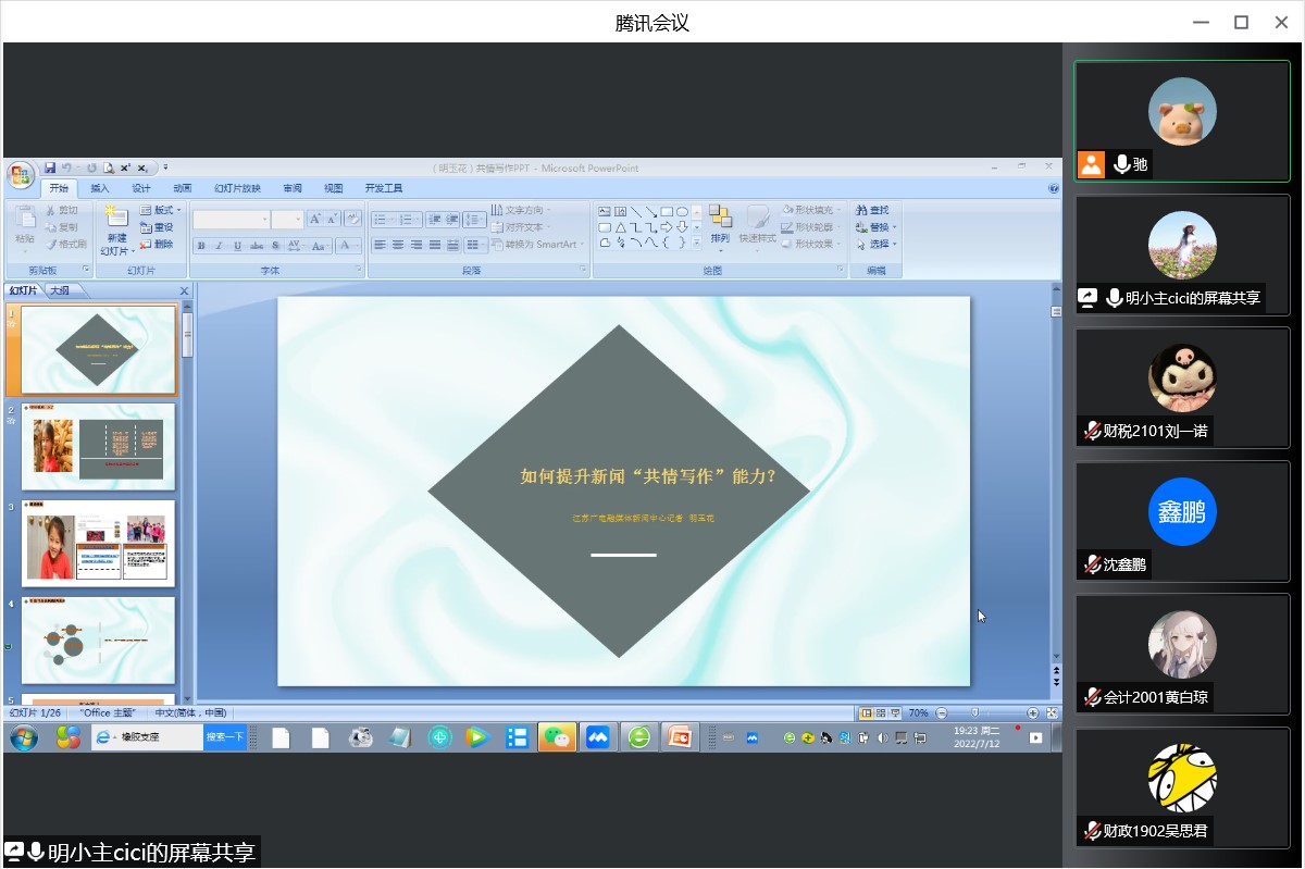 7月12日晚,江苏广电融媒体新闻中心资深媒体人明玉花围绕“如何提升新闻‘共情写作’能力”开展专题培训。明玉花表示,细节一定要从千头万绪中抓住,真诚是新闻故事的最大“套路”,而独特是吸引目光的“独门秘籍”。她表示,要寻找报道中的故事,并将其以多个优秀的新闻事例呈现,就要抓住细节、体现真诚、眼光独特。交流环节中,明玉花提出,随着时代的发展,短视频形式的新闻也不失为一种好方法,并分享了短视频“十条宝典”,令大家对短视频形式的新闻有了更深层次的认识。最后,明玉花就实用的新闻写作技巧、基本方法、写作特点以及写作的“几个不要”展开深入探讨,告诉大家写新闻稿要为时代发声,传递社会正能量。