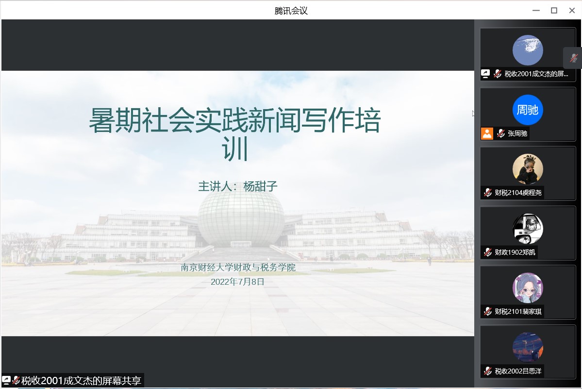 为提升学院新闻宣传工作队伍整体素养,近日,财政与税务学院“财情政暖”思政教育工作室于线上开展新闻宣传专题系列培训。培训由学院党委副书记李慕原主持,学院部分师生代表参加培训。