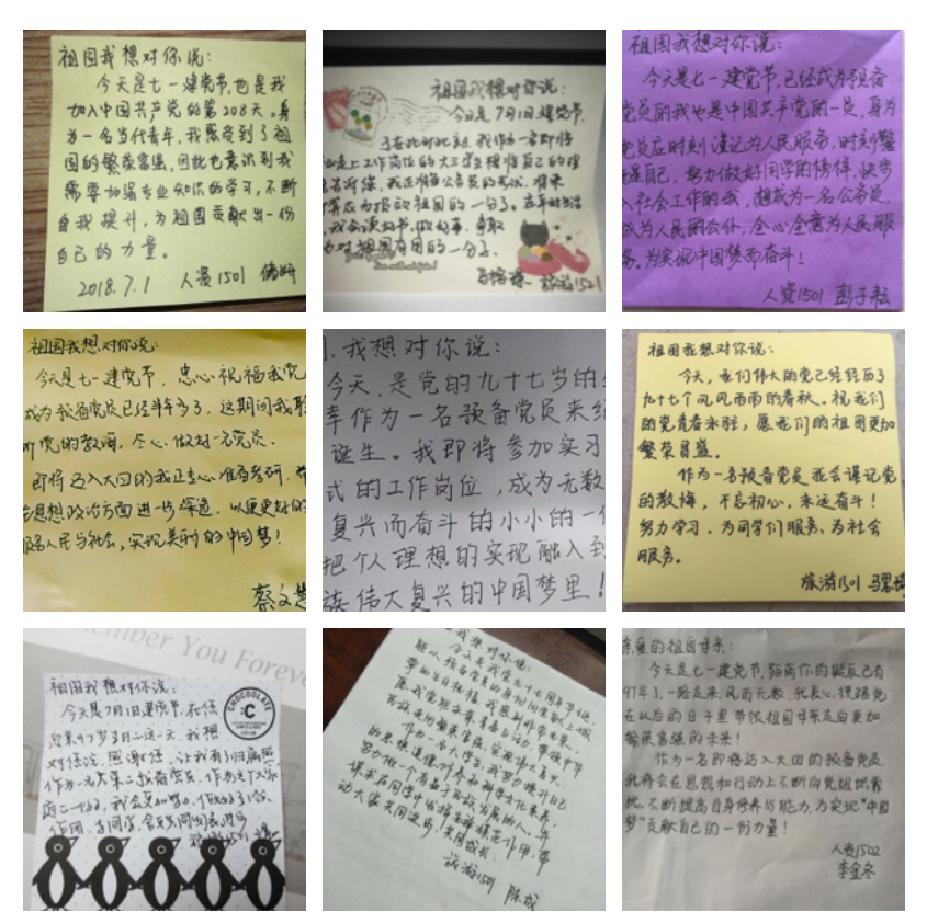 本科生第一党支部举办了“议党史、学优秀、思发展、创佳绩”主题教育活动,组织开展了“喜迎‘七一’,不负使命”建党节主题班会。本科生第二党支部开展了“祖国,我想对你说”活动,支部党员和积极分子将自己的理想、学习、生活和对祖国的祝福结合起来,支部成员互相学习交流。