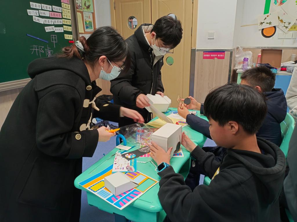 “趣味小手工”环节,志愿者们取出准备好的手工材料,邀请小朋友们一起拼装小汽车。在志愿者们的耐心引导下,小朋友们逐渐掌握了手工技巧。伴随着“咔咔”的剪纸声,一个个部件从纸板上跃然而下,在一双双小手中组装成为了一辆辆可爱迷你的小卡车。拼装完成后,小朋友们迫不及待地将自己的作品摆上桌面。原本平平无奇的纸板和彩纸经过志愿者和小朋友们的共同努力焕发光彩,变成了一辆辆精致的小卡车。小朋友们互相打量着各自的作品,脸上洋溢着开心的笑容。
