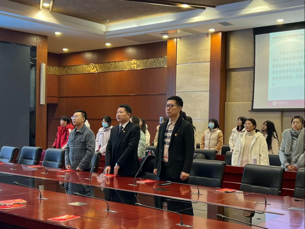12月2日上午,bat365在仙林校区工科楼二楼会议室设立大学生“宪法晨读”活动分会场,组织部分学生代表参与宪法学习,活动由法制办公室副主任韩启飞主持。会议开始前,全体师生为江泽民同志默哀。法制办公室副主任吴庚祐领读宪法部分条款,现场学生及全体人员跟读。同学们精神饱满,情绪激昂,大声跟随诵读,用心体会宪法的庄严,进一步了解到宪法是国家的根本大法,是治国安邦的总章程,是党和人民意志的集中体现,深刻领会中国特色社会主义法治精神,树立中国特色社会主义法治信仰。学习过程中,同学们聆听了歌曲《宪法伴我们成长》。