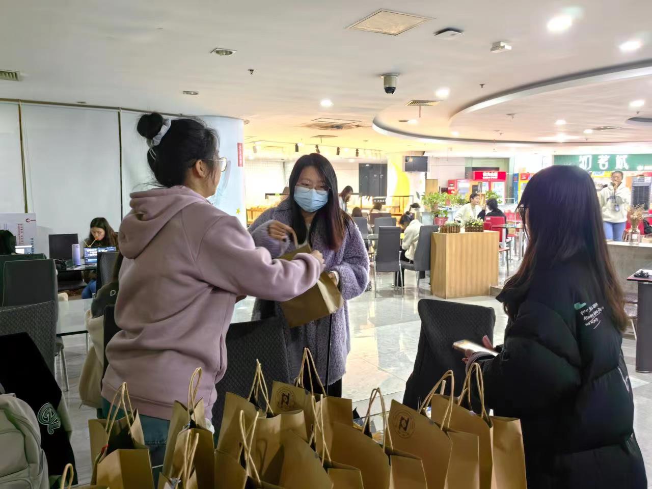 12月2日傍晚,志愿者们在书香地开展了第二波送温暖活动,给在图书馆备考的学长学姐们送去了礼物。学长学姐们表示定会全力以赴,不负努力,也不负学校与学院的期望。