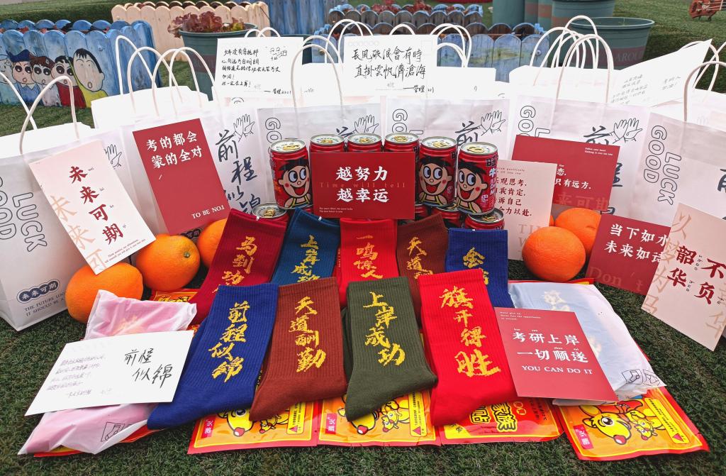 手工制作的曲奇饼干和祝福贺卡、象征“马到‘橙’功”的橙子、写满祝福的考研袜……为增强考研学子的信心,坚定大家的必胜信念,缓解临考压力,近日,各学院纷纷为考研学子精心准备了考研大礼包,在这寒冷的冬日送去温暖与祝福。