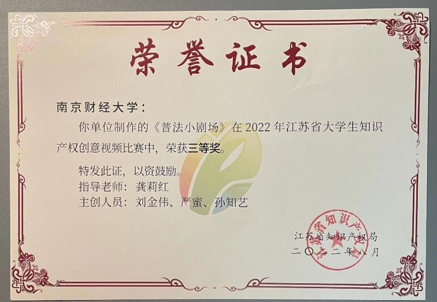 bat365学子获第六届江苏省大学生知识产权创意视频比赛三等奖