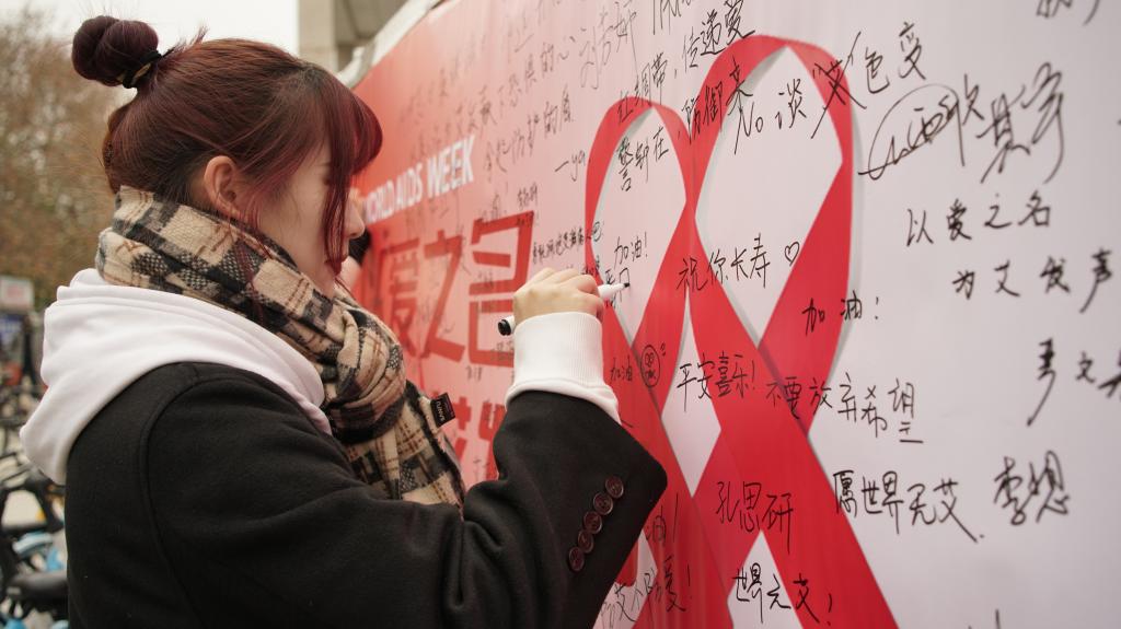 “如果我是艾滋病人,你愿意抱抱我吗?”身着玩偶服扮演艾滋病患者的两位“蓝经灵”志愿者吸引了同学们的注意。在参与答题和抽奖后,许多同学纷纷主动上前拥抱两位“患者”,为寒冷的冬日送上温暖的抱抱。此外,活动现场还设有签名展板,“蓝经灵”志愿者引导同学们有序地在展板上签名,并写下对艾滋病患者的鼓励和祝福。