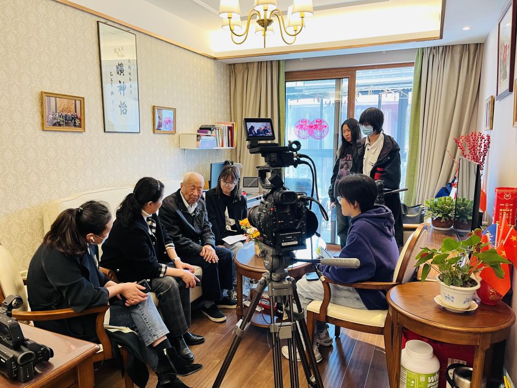 3月13日下午,新闻学院“追寻红色印记 弘扬伟大建党精神”团队师生一行在张蓓老师带领下,来到银城君颐东方国际康养社区采访革命老兵曹天渊,以聆听记录革命故事的方式赓续红色精神。