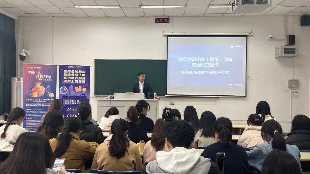 携手华泰开展求职安全教育宣传。学院通过“知识点+案例”的形式向同学们传授了反电诈相关知识,结合金融电信(网络)诈骗和非法集资的相关案例,深入分析诈骗手段,让同学们更加直观清晰地了解这些诈骗形式,提高反诈意识。