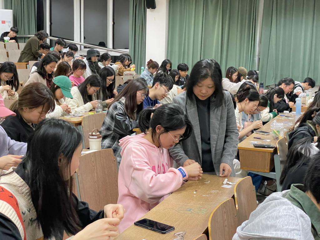 非遗传承人进课堂,师生共制墨竹图。4月12日晚,“民间美术与创意设计”课程组邀请绒花制作技艺市级传承人、市工艺美术协会会员程颖及一澈文化咨询有限公司资深平面设计师、南京市民间文艺家协会会员许昕走进课堂,为同学们传授缠花技艺。课堂上,两位老师展示了缠花作品,为每位同学分发了各色丝线及道具,并以制作缠花胸针为范本,手把手地教大家如何用丝线制作完成一片片精致的竹叶。课程组准备了一幅1米长的墨竹图。剪纸、劈线、缠花、贴画……同学们聚精会神地埋头制作,体会传统手工的奇妙。两个多小时的课堂里,在100余位同学的接力下,一幅惊艳的缠花墨竹图完成了。“希望通过非遗‘缠花’进课堂的形式让非遗不只是停留在看的阶段,更希望同学们能在实操中感受到艺术传承。在之后的课程中,我也会继续带领不同专业的同学们制作各类集体作品,让民间美术走进学生群体中。”课程组管静老师说道。