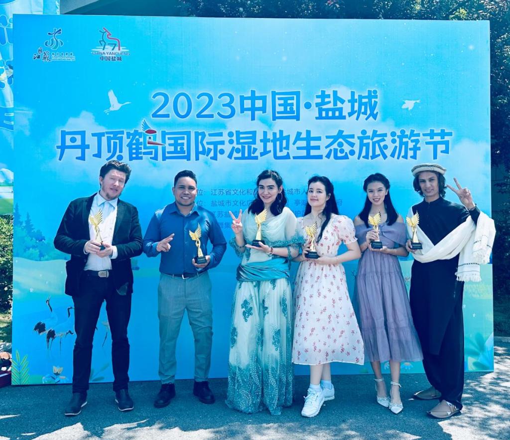 卜琪美(AMIDALA SUNJOYO)(右二)、姜美丽(JAXYBEKOVA MARIAM)(右三)获评“盐城文旅国际推荐官”
