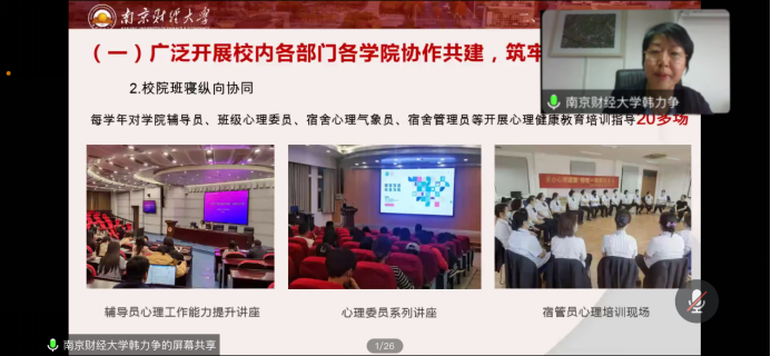 bat365党委学生工作部部长、学生处处长韩力争在发言中介绍了bat365心理健康教育工作的发展现状和队伍配置,重点讲解了中心教育教学、实践活动、咨询指导、预防干预为主要内容的“四位一体”育人体系以及校内、校际、家校、医校、校地协作的“五协联动”工作机制。
