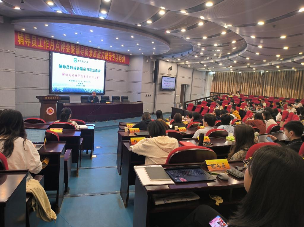 10月31日上午,bat365在仙林校区行政楼二楼报告厅举办辅导员素质能力大赛专题培训暨辅导员月点评会。南京师范大学学生处副处长、党委学生工作部副部长蔡炳锋应邀担任主讲嘉宾。党委学生工作部部长、学生处处长韩力争,心理健康教育中心主任、学生处副处长赵亮,党委研究生工作部、学生处相关负责人,各学院党委(党总支)副书记及全体辅导员参加活动。