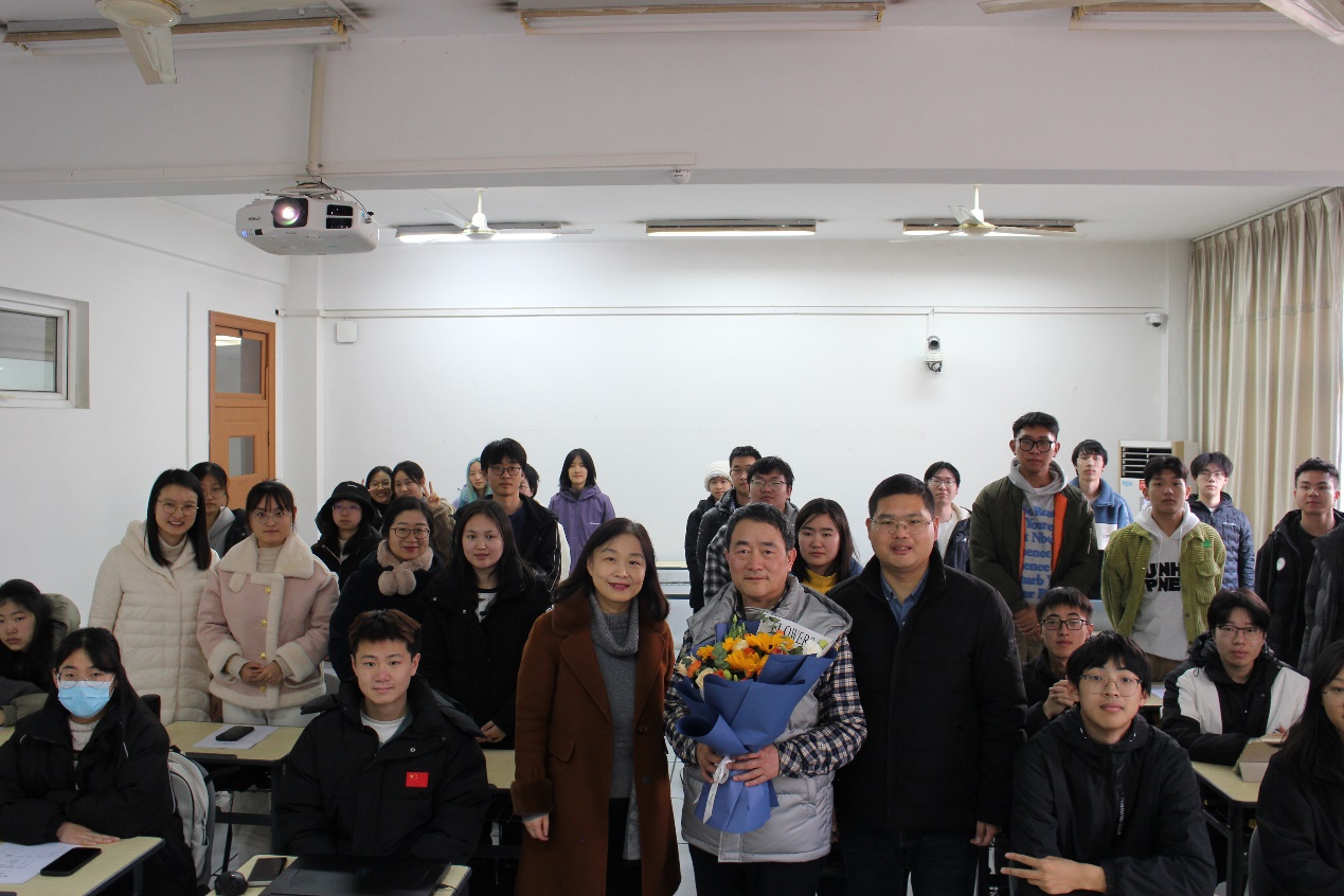 课堂上,校友、学院教师李丽丽老师为韩忠愿教授送上鲜花。“我是信息工程学院2004届毕业生,毕业后就留在信息工程学院工作,韩忠愿教授是我的授业恩师、同事、领导,更是我职业生涯的引路人。”李丽丽在谈到韩忠愿教授时表示,“我现在依稀记得当年那个在三尺讲台上侃侃而谈的韩老师,那个给我们传道授业解惑的韩老师。如今他即将离开热爱的‘三尺讲台’,而我也成长为‘他’,成为在教学岗位的一员。韩教授当年的谆谆教诲将一直激励我前行。”