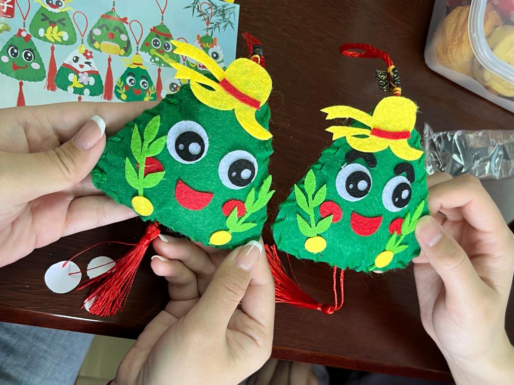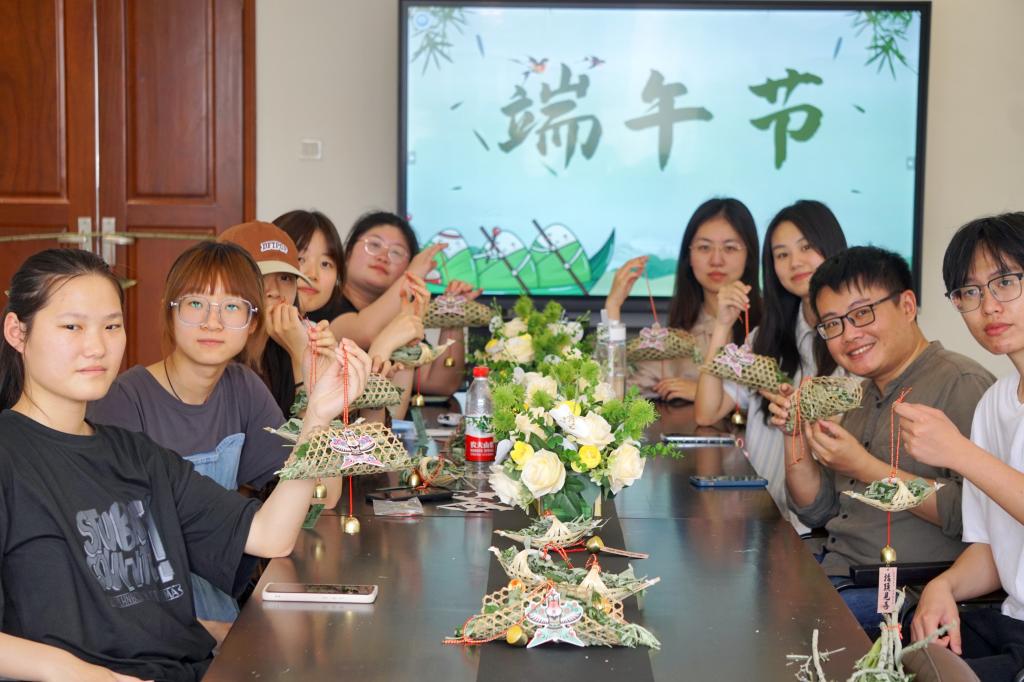 外国语学院本科生党支部和国际合作与交流处党支部师生党员围坐在一起,体验手工布艺制作。大家纷纷发挥自己的创意和想象力,编织竹片、填充艾草、扎丝带、绑铃铛,将菖蒲叶、玉簪叶、玩偶和福袋制作出了形态各异、色彩斑斓的粽子挂饰、龙舟灯、艾草花环等,大家捧着自己的劳动成果喜不自胜。
