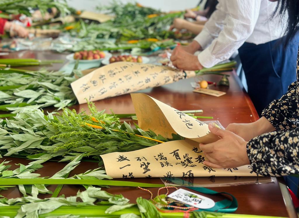 营销与物流管理学院开展“老青共话,艾香端午”主题活动。校工会、离退休工作处、学院相关领导,退休教师代表,学院教师代表参加活动。活动分为“端午节知识竞猜”“DIY艾草花束制作”两个环节。竞猜题目涵盖了传统习俗、古诗词等内容。制作环节,老师们化身花艺匠人,DIY艾草花束,现场氛围其乐融融。民盟盟员、退休教师吴志华教授通过《感恩》《情粽》两幅书法作品表达了对师生们的节日祝福。