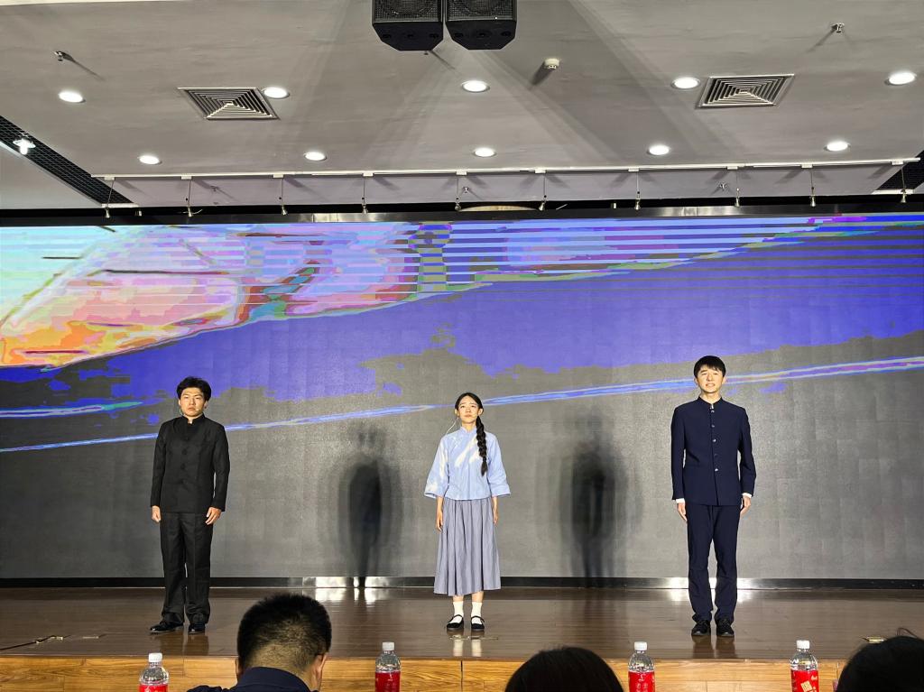 下半场比赛在《我的南方和北方》的朗诵声中展开。《黎明的通知》将艾青的名作表达得诗意盎然,让人仿佛看见黑暗中黎明的曙光;《琵琶行》中两位选手生动演绎琵琶女和江州司马,赢得全场喝彩;最后18人团队朗诵著名诗人昌耀的名作《划呀,划呀,父亲们!——献给新时期的船夫》,展现了劈波斩浪的船夫们的信念与勇气,谱写了一首坚韧不屈的生命赞歌。新闻学院五位指导教师表演《美哉!诗经》,描绘了《诗经》“蒹葭苍苍,白露为霜”的抒情之美,将现场气氛推向高潮。