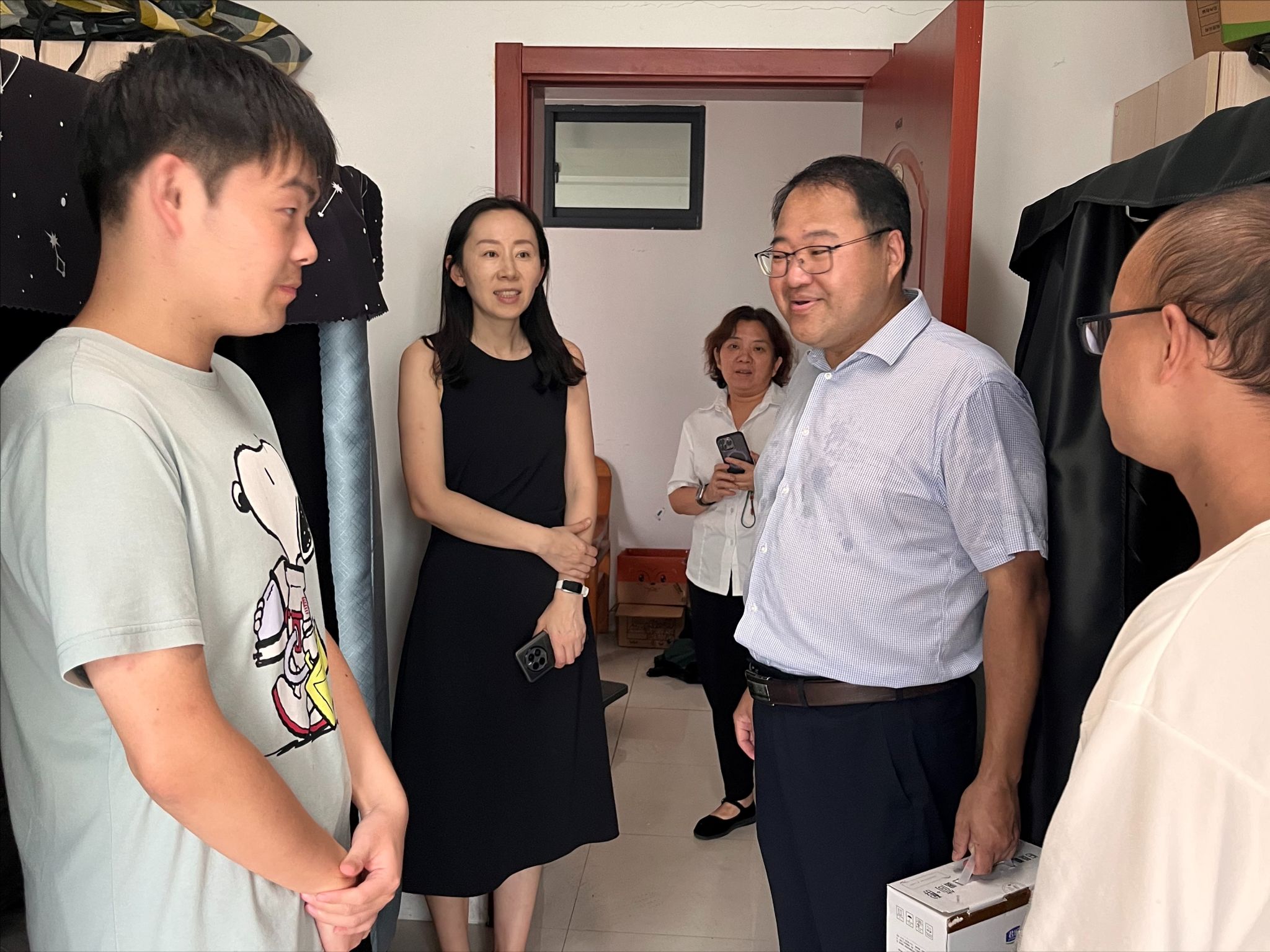 党委学生工作部部长、学生处处长韩力争,党委研究生工作部部长郝园园,研究生院院长沈永建,党委学生工作部副部长、学生处副处长袁怡琨等一行走访北苑、东苑、中苑、西苑等多个宿管站,走进多处位于五楼、六楼的高楼层学生宿舍,看望慰问留校学生,了解台风来临时基本情况,察看寝室内受台风影响状况,并指导学生及时报修。针对个别高楼层寝室出现阳台积水、屋顶漏水等情况,韩力争部长要求宿管人员及时登记报修,并实时跟进确保尽快解决,保障同学们在公寓的正常生活。郝园园部长、沈永建院长与同学们深入交流,了解研究生新生入学后学习适应情况,并送去节日问候。同学们对领导老师的来访表示感谢,表示台风虽然猛烈,但在寝室里影响不大,也不觉得紧张或害怕,对于台风造成的生活上的一些不便,也会努力克服。