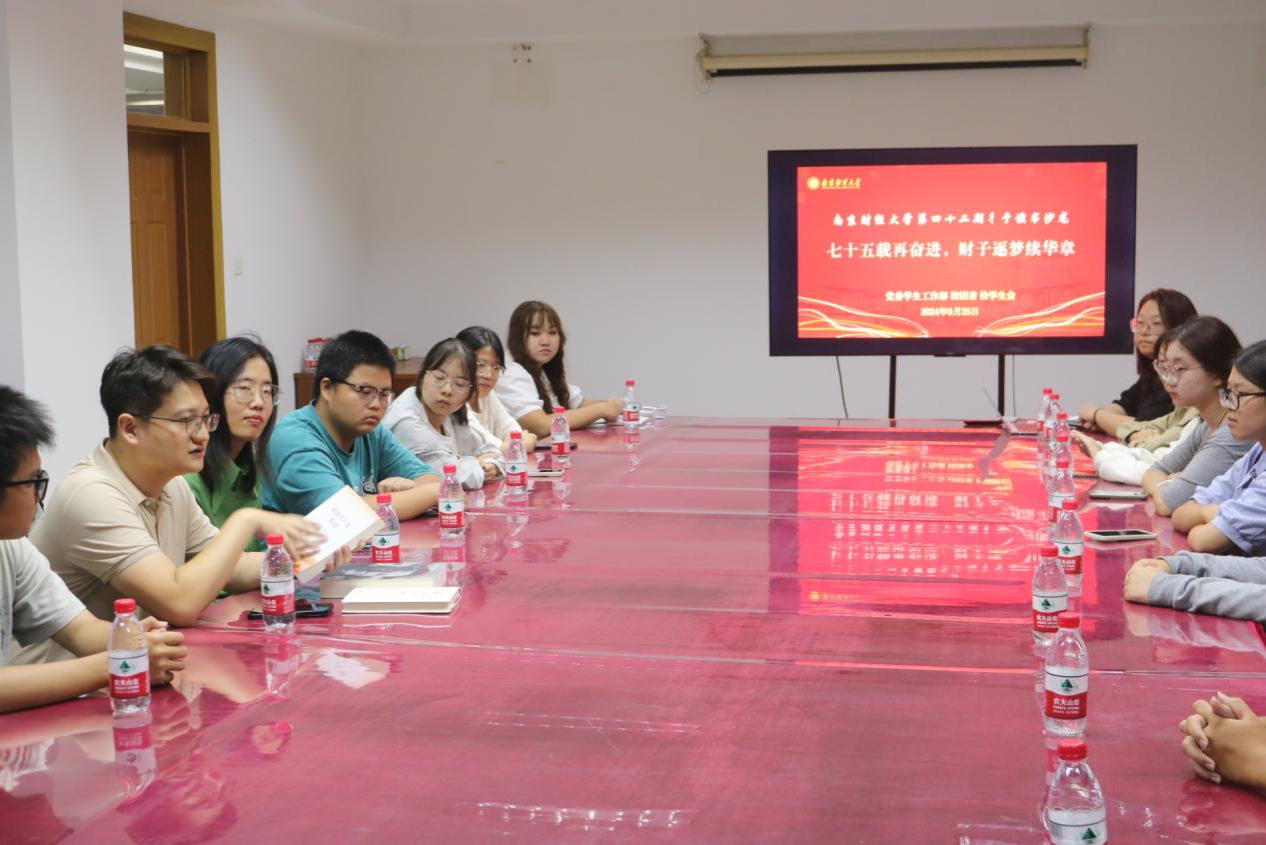 会前,大家共同观看《开国大典》原始影像,再次回顾新中国成立时的峥嵘历史。在肃穆的氛围中,范渊凯副教授带领同学们全景式浏览三本红色经典《中国共产党简史》《邓小平时代》和《初心一叶:党史中的人与事》,他表示,三本书分别从官方、国外、国内三个视角深度解读党的重大历史事件和重要历史人物,是全面深刻理解中国共产党历史逻辑和伟大精神的重要窗口。他从自身求学工作经历引入《邓小平时代》,深入剖析邓小平同志如何以卓越的领导才能和深远的战略眼光,以总设计师的魄力奠定了新中国改革开放的基石,铺就了祖国富强的宏伟道路,启发同学们感悟走中国特色社会主义道路是历史必然,体会邓小平同志面对挫折始终不改红色信仰、务实寡言、人民为本的崇高精神风范,以此坚定理想信念,传承伟人精神,在新时代苦练本领能力、提升格局胸襟,将青春奋斗融入国家发展和民族振兴的事业中。