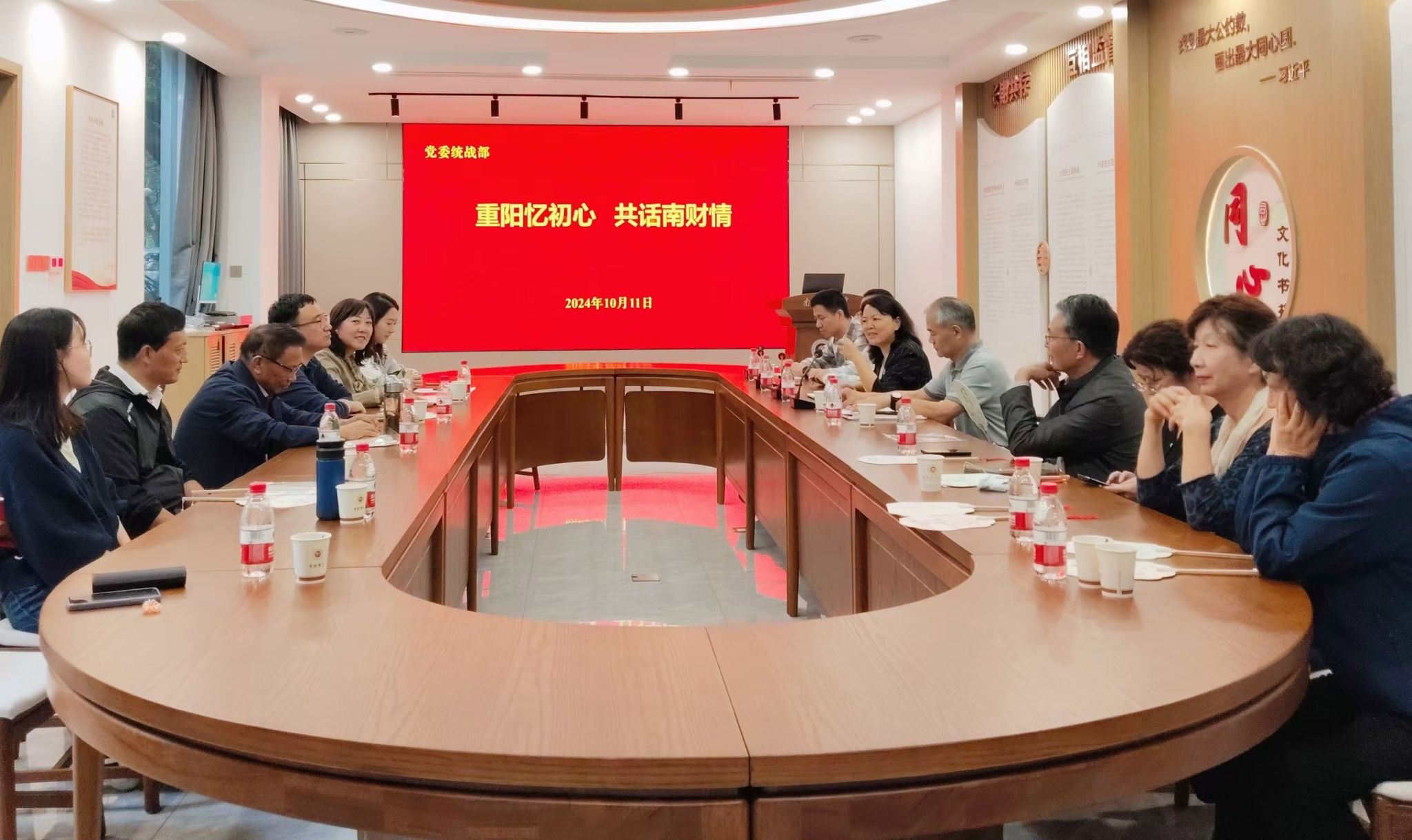 党委统战部在同心文化书苑举办“重阳忆初心 共话南财情”茶话会。党委常委、统战部部长李玉琴,校民盟委员会主委沈新春,党委统战部全体工作人员以及部分民主党派退休教师代表参加活动。活动由民主党派退休教师代表、校民盟委员会秘书长范红梅主持。与会成员们依次踊跃发言,回忆校史校情、分享工作生活感悟,并对学校发展提出期待建议。李玉琴部长向各位与会成员致以诚挚的节日问候,并提出组建“同心银发志愿服务队”的倡议。与会成员纷纷积极响应号召,表示将以老当益壮的健康心态和进取精神为推动“银龄”志愿服务实践作出积极贡献。会后,大家还进行了非遗文化漆扇体验活动。