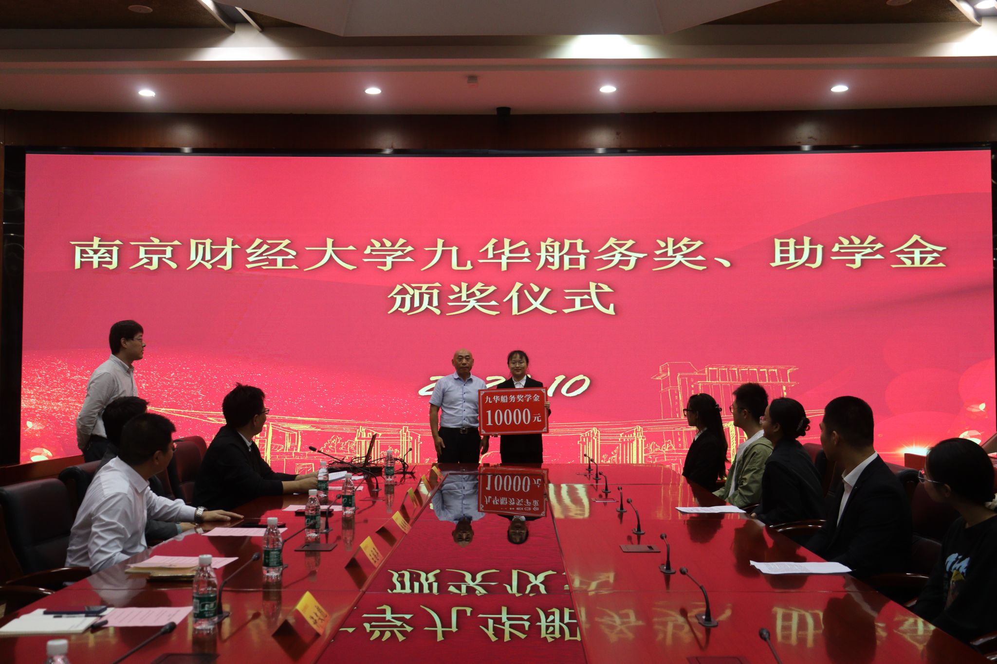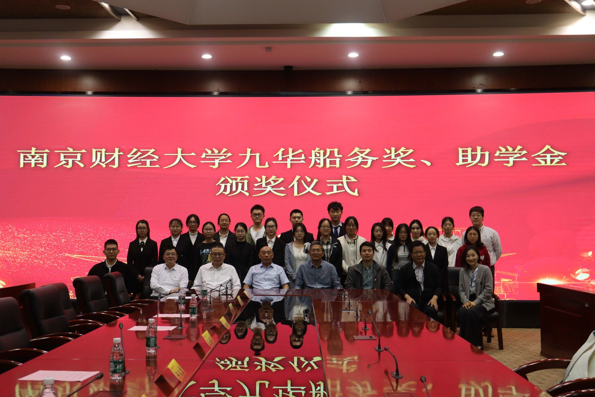 胡心淼副书记宣读九华船务奖、助学金获奖名单。王国年校友为获奖同学颁奖并合影留念。获奖学生代表林玲、潘永清先后发言,表达了对学长王国年的真挚感谢,并表示会带着这份荣誉和激励,以更加饱满的热情、更加昂扬的斗志,创造更加优异的成绩,回报母校、回馈社会。