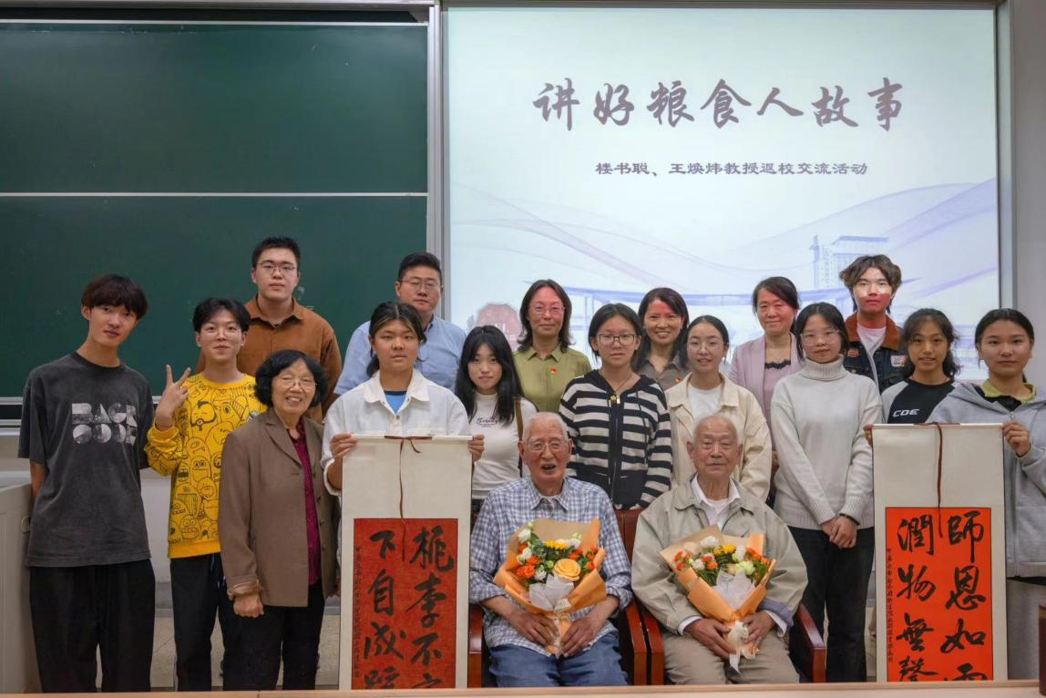 外国语学院在仙林校区德正楼112室开展了以“用外语讲好粮食故事”为主题的精彩访谈活动。学校两名91岁高龄的退休教师楼书聪和王焕炜与来自外国语学院、梅西学院、工商管理学院的师生们欢聚一堂,共同探讨如何用外语向世界传递中国粮食人的故事与精神。外国语学院党委书记李骏、党委副书记孙大松,离退休工作处处长唐习华,教师代表参加活动。活动中,两位教授分享了自己在粮食与化学领域的丰富经验,用浅显易懂的语言与学子们分享了自己的切身经历。他们的故事中充满了艰辛与奋斗、奉献与坚持,同学们深刻感受到了粮食人对土地的热爱、对粮食的敬畏以及对美好生活的追求。外国语学院的同学们献上了精美的书法作品,用笔墨表达对粮食人的敬意。交流互动环节,同学们就生活中的困惑与老教授们进行了深入交流和探讨,老教授们耐心细致地作了解答,赢得了同学们的阵阵掌声。