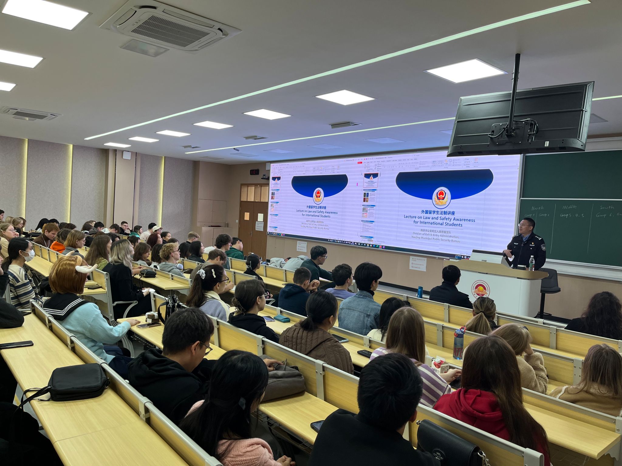 李智警官围绕护照、签证、居留证件及住宿登记等议题,详细阐述了留学生签证办理流程及应注意的细节。他结合法律法规和实际案例,深入讲解了在华留学期间的居留管理规定。祝军警官以中国法律概述、南京市外国人居留现状、涉外案件剖析及温馨提示为主线,进行了系统的法律法规宣讲。通过生动案例与法律条文的结合,祝军警官对人身安全、交通安全、网络安全等方面的知识进行了深入浅出的讲解。两位警官希望留学生们在华学习期间,加强法律法规学习,自觉遵守中国法律法规及校规校纪。