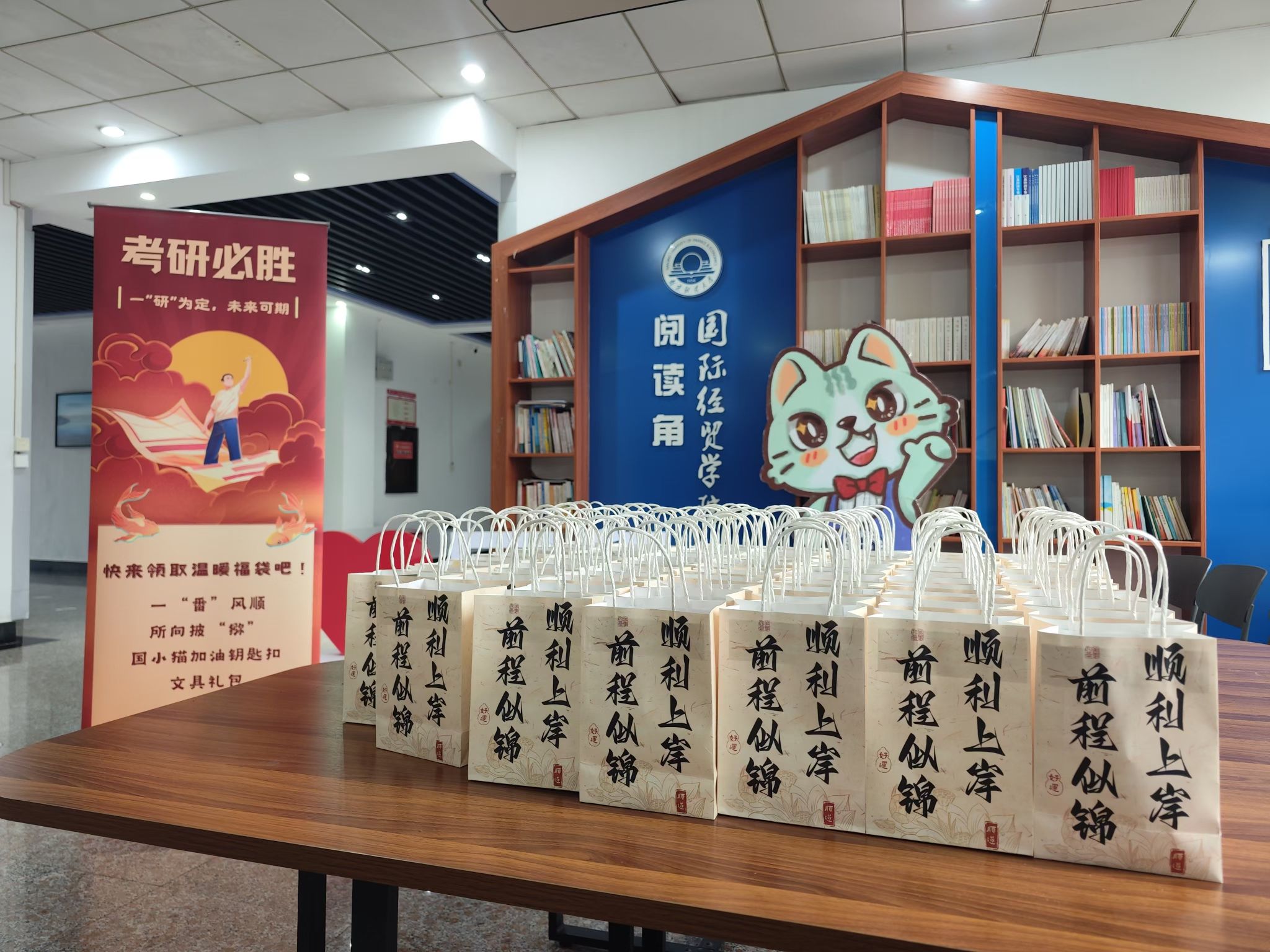 国际经贸学院精心准备了加油福袋,寓意考研之路一“番”风顺的小番茄串果、盼君考场所向披“猕”的香翠猕猴桃、吉祥物“国小猫”加油钥匙扣、“连中三元”文具礼包和“顺利上岸,前程似锦”手提袋,一件件饱含心意的礼物,满载着学院对考研学子的关怀与祝福,为考研学子注入温暖与力量。志愿者们为考研学子送上福袋和祝福,研究生学长学姐也为考研学子传授备考心得。